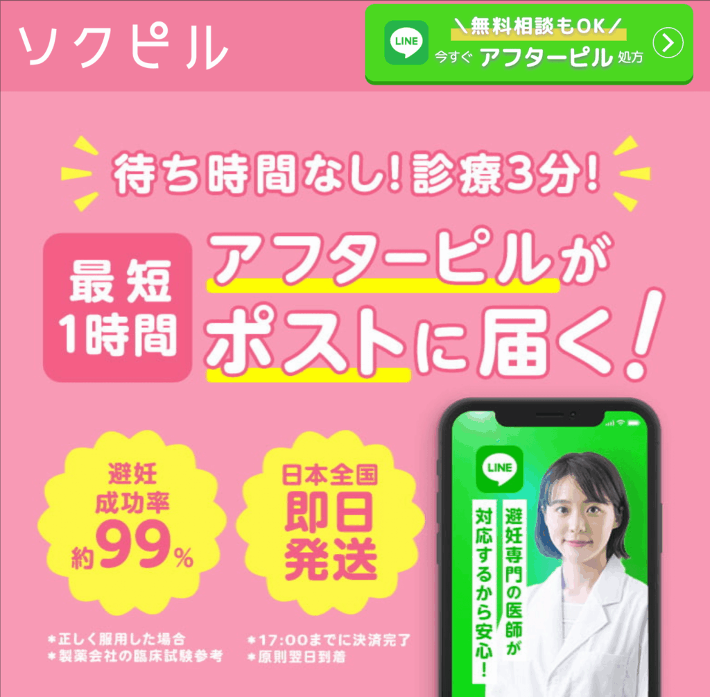 特急ピルっていうサービスがあるからLINE登録すれば数分医者と電話するだけで簡単に処方してもらえるよ、当日配送だから翌日には届くはず